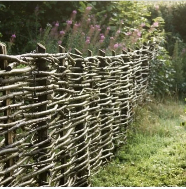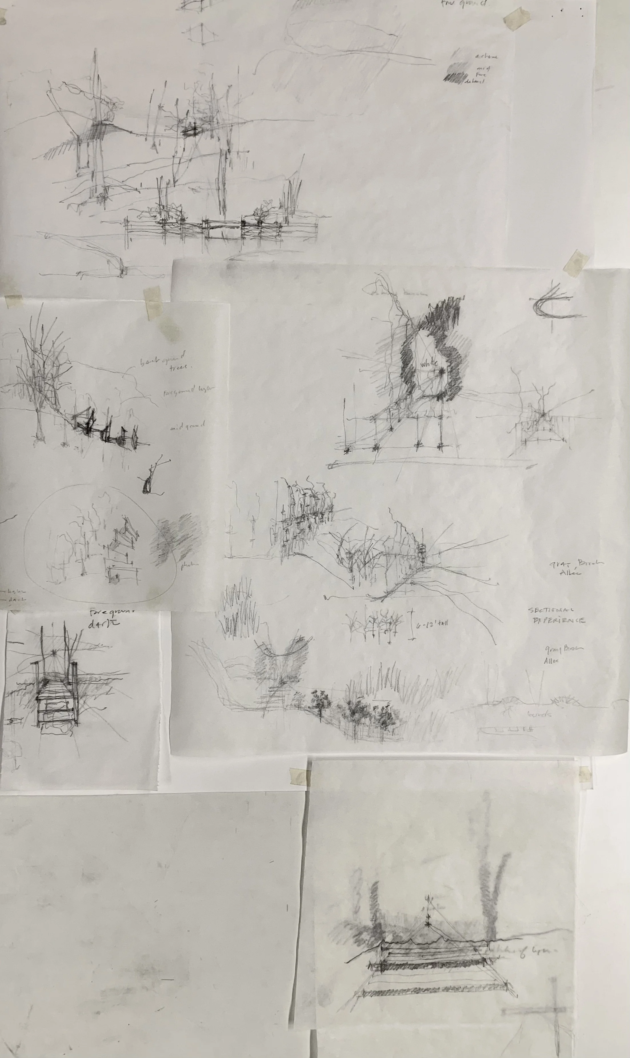 -Concept development: Use woven fences to capture leaves and natural detritus to minimize erosion + maximize soil retention, reduce widths of pathways + encourage native growth and compost. Plant a copse in lower gravel pit area to provide material for woven fences, decreasing the need to collect leaf and branch debris from other areas of the site. Redirect rain water along steep paths + slopes to encourage growth of the existing Gray Birch and Aspen.